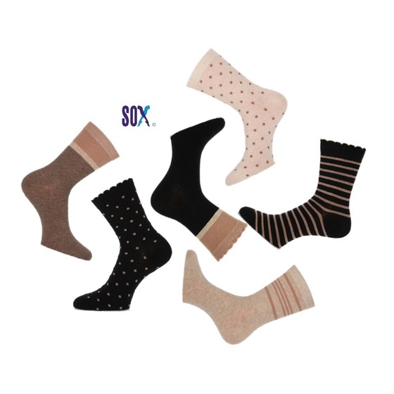 Set van 6 paar verschillende leuke sokken in de modekleuren zwart/camel/ecru en met een beetje lurex .