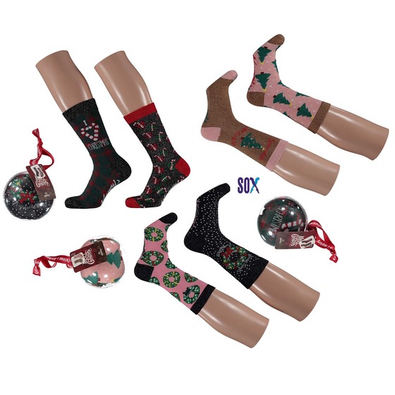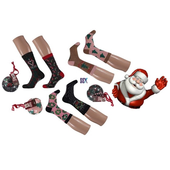 6 paar leuke kerstsokken met kerstprint verpakt in kerstbal per 2 paar..